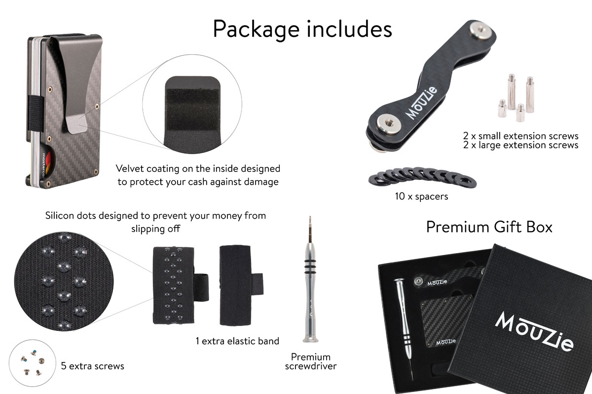 Pachetul complet include atat money clip cat si banda elastica pentru bancnote pentru a da posibilitatea utilizatorului sa aleaga oricand una din cele 4 variante: Money Clip, Cash strap, simple sau all in. Pentru fiecare dintre aceste variante gasiti instructiunile de configurare in format video accesand pagina instructiuni de utilizare.